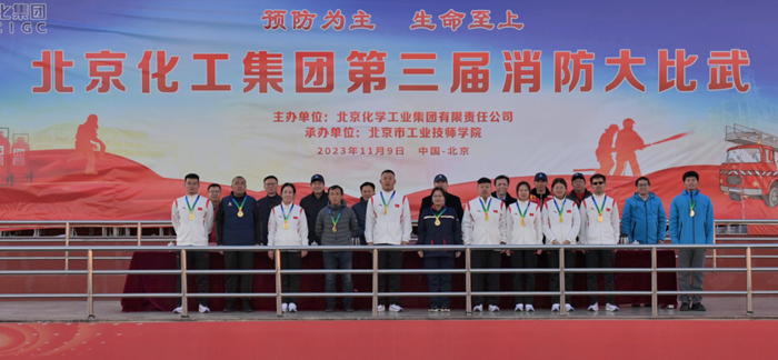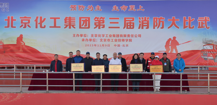 在全国第32个“119”消防宣传日当天,北京化工集团第三届消防大比武在技师学院举办,党委书记、董事长陈宇致开幕词,党委副书记吴瑞峰主持开幕式并致闭幕词,党委常委、副总经理韩宝海主持闭幕式,来自全系统的350多名职工参加大比武。