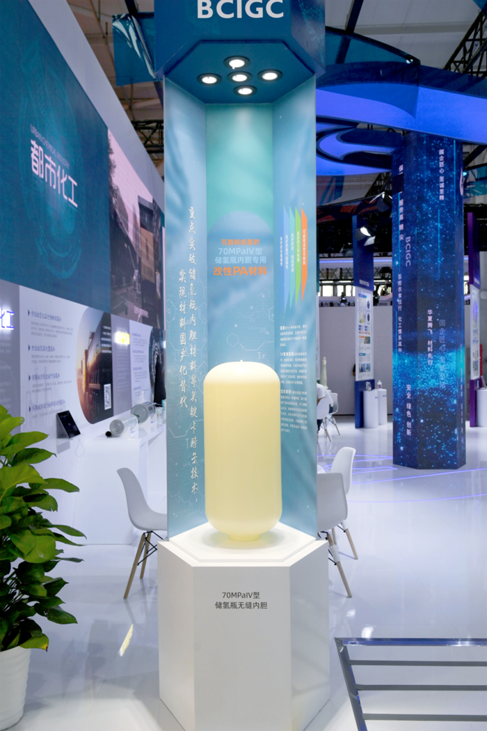 刚刚迈入北京化工集团展位所在的4号展厅,在大门左侧,近1米高的储氢瓶内胆吸引了观展人群的目光,由集团所属华腾京研公司正在研制的,重点突破储氢瓶内胆关键材料等 “卡脖子”技术的内胆实物,将人们引进北京化工集团的展位。