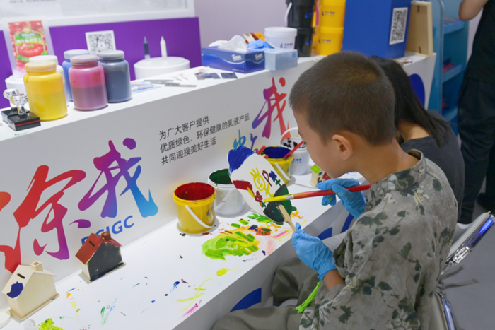 在“涂我、粘我”展区,大朋友、小朋友们纷纷拿起小扇子、小木制房子,用不同的涂料在上面作画、上颜料;在干箱手套互动区,观展者兴致勃勃地套上干箱手套,模拟化学试验操作,将试剂滴入不同化学液体中,观察其中的变化;在防静电手套互动区,观众们纷纷体验不戴手套的“麻酥”感和戴上手套后的安全感。3个互动区使观展者在动手参与中了解产品的特性,对化学让生活更美好有了切身的感受。
