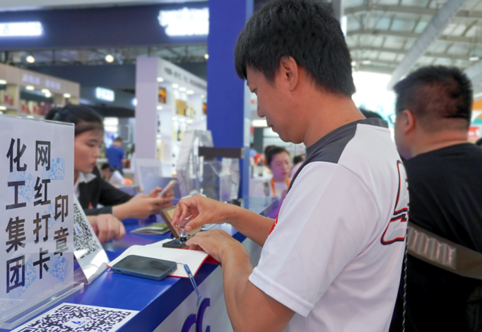 网红打卡印章,是此次参展的又一亮点,集团为此专门制作了有集团名称楼宇的印章。“4号馆,北化集团,3免(3个印章、免费)”的服贸会攻略已在“小红书”上传开,人们纷至沓来,在关注集团微信公众号后,将“北京化工集团”印在自己的本上,让北京化工在潜移默化中传播。